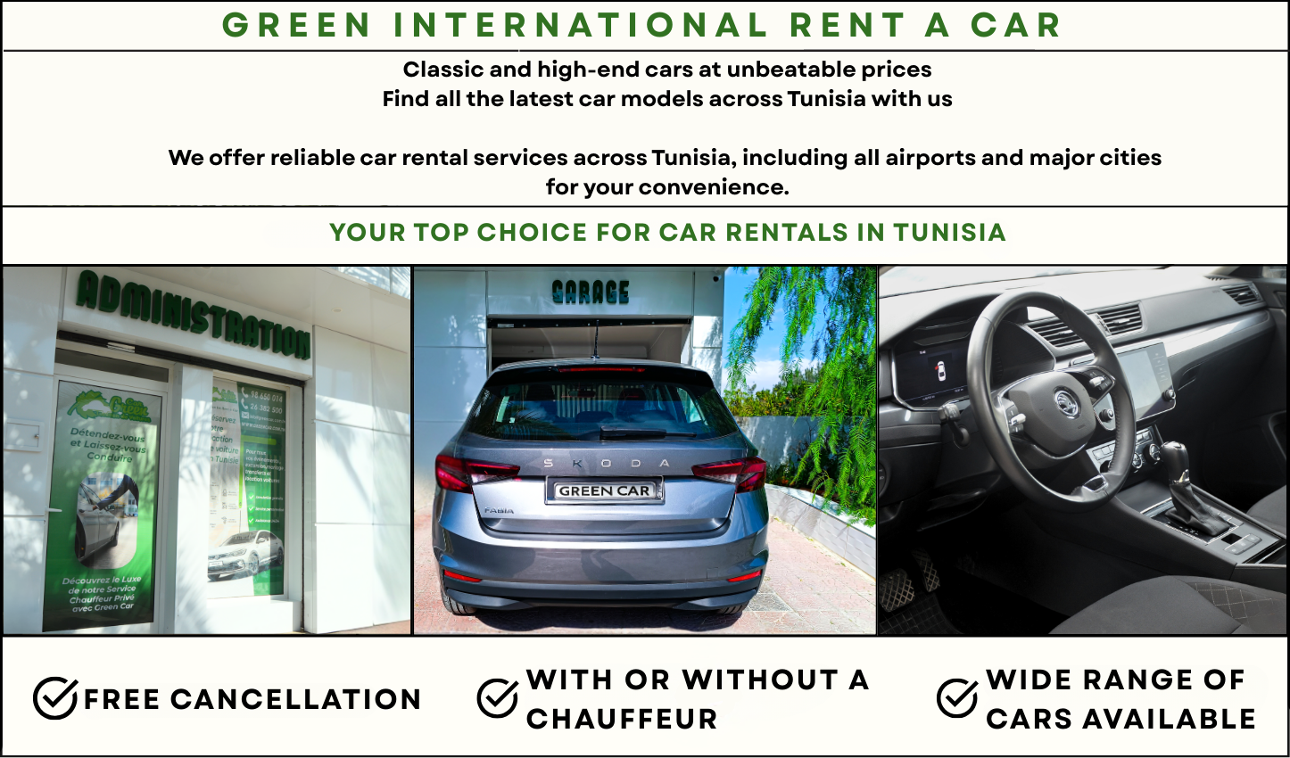 Green Car has several car rental agencies located in major cities of Tunisia such as Tunis Capital, Hammamet and Djerba.